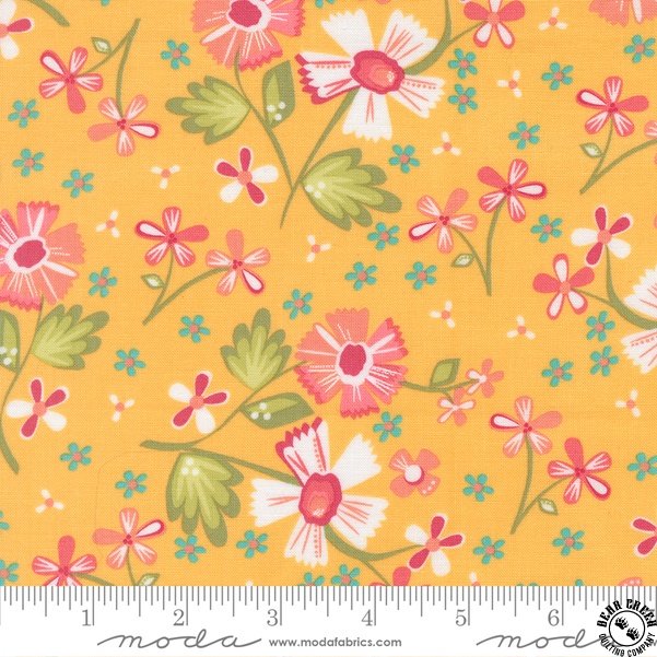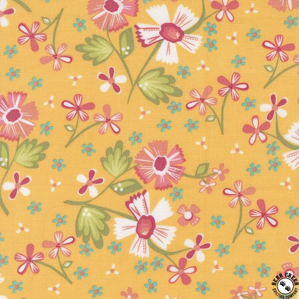 In the Garden  fabric collection features a rainbow of the warm colors that I so enjoy sewing with… pinks, corals, yellows, greens, and aquas.  Ever since my first collection, I have also enjoyed how nicely a warm gray plays with all of those sherbet brights.  You will find my beautiful signature grays in this collection.  Over the years, I have often joked that I can’t grow a beautiful flower garden outside (this girl does not have a green thumb!) but I can create flower-filled fabrics!  In the Garden is bursting with flowers; wildflowers, daisies, blossoms, and buds are spread throughout.