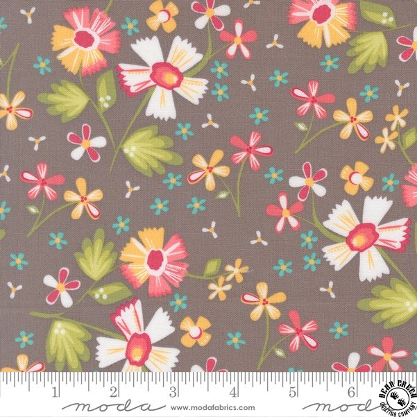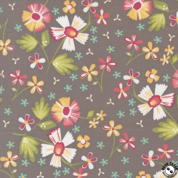 In the Garden  fabric collection features a rainbow of the warm colors that I so enjoy sewing with… pinks, corals, yellows, greens, and aquas.  Ever since my first collection, I have also enjoyed how nicely a warm gray plays with all of those sherbet brights.  You will find my beautiful signature grays in this collection.  Over the years, I have often joked that I can’t grow a beautiful flower garden outside (this girl does not have a green thumb!) but I can create flower-filled fabrics!  In the Garden is bursting with flowers; wildflowers, daisies, blossoms, and buds are spread throughout.