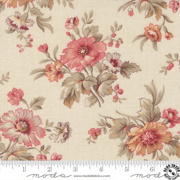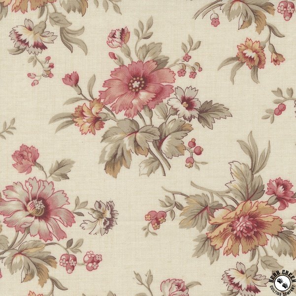 is a soft, romantic interpretation of early 19th-century French prints, evoking the charm of an old French parlor or a lady’s dressing room.  The larger, multicolored floral motifs are perfect for fussy cutting—ideal for creating lovely appliqués, hexagons, and other delicate designs.  Of all the collections we’ve created over the past fifteen years with Moda, this one is our absolute favorite.  It harmonizes beautifully with our previous collections, offering endless possibilities for mixing and matching.