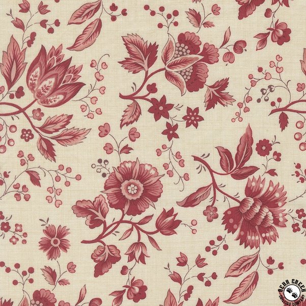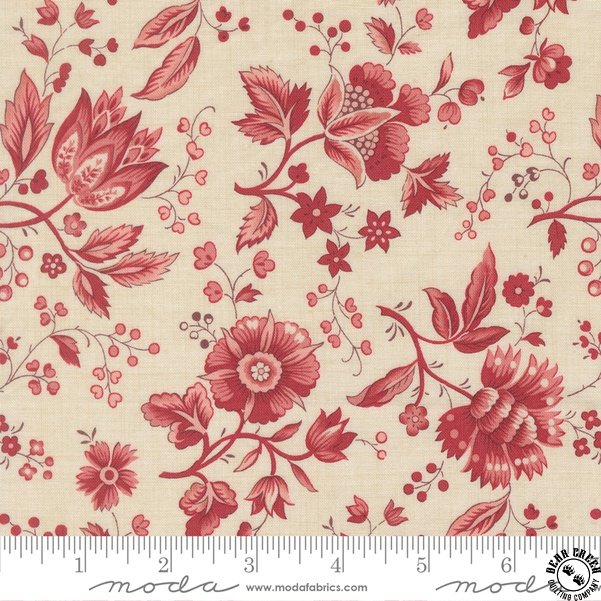 is a soft, romantic interpretation of early 19th-century French prints, evoking the charm of an old French parlor or a lady’s dressing room.  The larger, multicolored floral motifs are perfect for fussy cutting—ideal for creating lovely appliqués, hexagons, and other delicate designs.  Of all the collections we’ve created over the past fifteen years with Moda, this one is our absolute favorite.  It harmonizes beautifully with our previous collections, offering endless possibilities for mixing and matching.