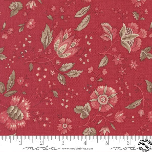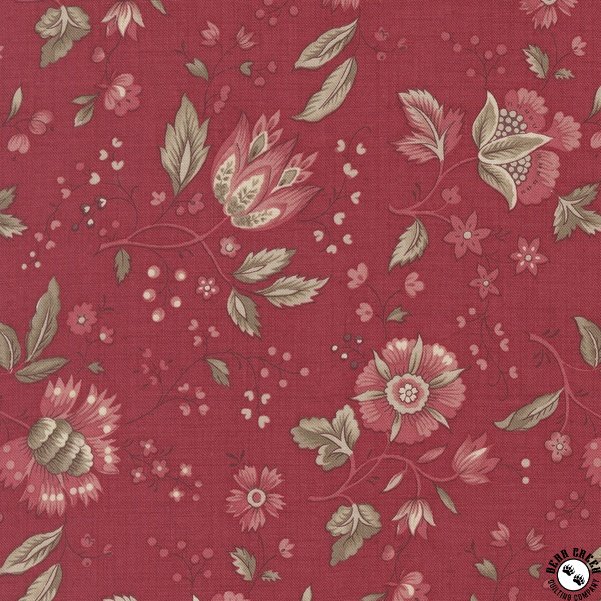 is a soft, romantic interpretation of early 19th-century French prints, evoking the charm of an old French parlor or a lady’s dressing room.  The larger, multicolored floral motifs are perfect for fussy cutting—ideal for creating lovely appliqués, hexagons, and other delicate designs.  Of all the collections we’ve created over the past fifteen years with Moda, this one is our absolute favorite.  It harmonizes beautifully with our previous collections, offering endless possibilities for mixing and matching.