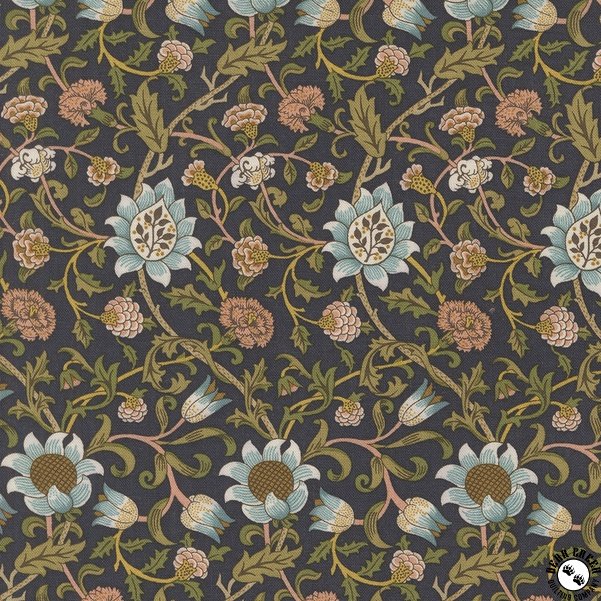 Morris Manor from Barbara Brackman is Moda's latest update of William Morris's classic design. The collection is named for the family's summer home Kelmscott Manor, a riverside house they began renting annually in the 1870s. Morris thought Kelmscott Manor heaven on earth, a spot he captured in colors echoing the seasonal view. At the Morris Manor they boated, their girls grew up and Morris tended his gardens that provided inspiration for the floral prints. We've recolored a few of our favorites from early Morris lines in river-inspired shades of blue and green. Print collectors will be glad to know we've added some not reproduced earlier, such as the leafy Branch and the Scroll floral. These prints will inspire your Arts & Crafts decorating and patchwork projects.