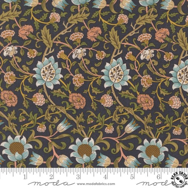 Morris Manor from Barbara Brackman is Moda's latest update of William Morris's classic design. The collection is named for the family's summer home Kelmscott Manor, a riverside house they began renting annually in the 1870s. Morris thought Kelmscott Manor heaven on earth, a spot he captured in colors echoing the seasonal view. At the Morris Manor they boated, their girls grew up and Morris tended his gardens that provided inspiration for the floral prints. We've recolored a few of our favorites from early Morris lines in river-inspired shades of blue and green. Print collectors will be glad to know we've added some not reproduced earlier, such as the leafy Branch and the Scroll floral. These prints will inspire your Arts & Crafts decorating and patchwork projects.