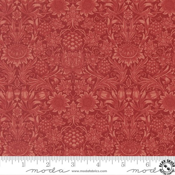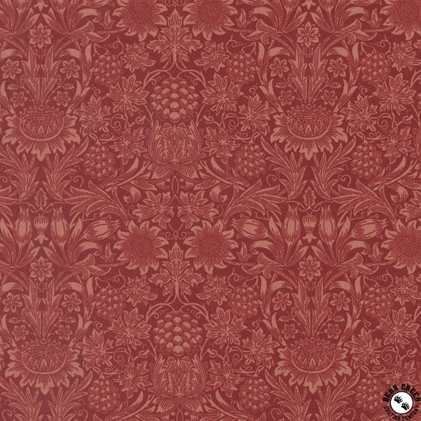 Morris Muse celebrates the unsung women of Arts and Crafts design. William Morris and fellows valued female associates as models, lovers, and muses—inspiration for male artistic creation. Morris’s wife, Jane Burden Morris, a classic “stunner” as the men termed the beauties, earned no fame for her talents, yet she and daughter May were artists in their own right, designing, stitching, and overseeing masterpieces of Morris needlework. Despite late-century conventions that kept them behind the screens and drapes they stitched, women in Arts and Crafts circles were true design partners. Prints in the Morris Muse collection continue innovations in natural patterns with rich reds and color complements echoing interior fashion and the women’s personal style.
