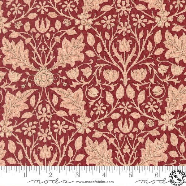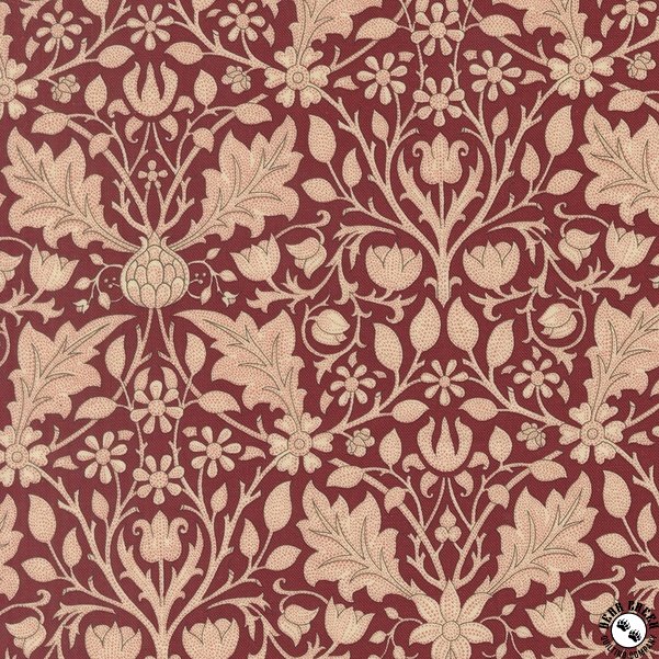 Morris Muse celebrates the unsung women of Arts and Crafts design. William Morris and fellows valued female associates as models, lovers, and muses—inspiration for male artistic creation. Morris’s wife, Jane Burden Morris, a classic “stunner” as the men termed the beauties, earned no fame for her talents, yet she and daughter May were artists in their own right, designing, stitching, and overseeing masterpieces of Morris needlework. Despite late-century conventions that kept them behind the screens and drapes they stitched, women in Arts and Crafts circles were true design partners. Prints in the Morris Muse collection continue innovations in natural patterns with rich reds and color complements echoing interior fashion and the women’s personal style.