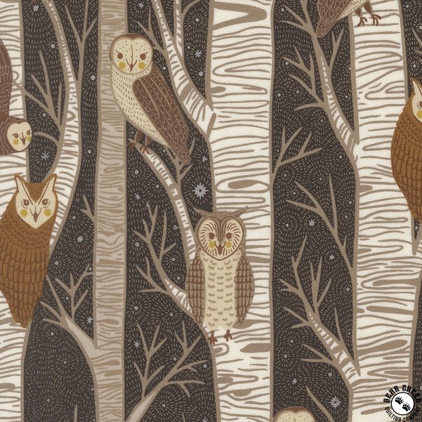The palette is rich and grounding, with midnight blues, mossy greens, earthy browns, and soft silver highlights that capture the serene glow of a starlit night. Ideal for cozy quilts, imaginative apparel, and woodland-inspired home decor, Night Owl by Stacie Bloomfield transforms your creations into timeless treasures that echo the mystery and elegance of the forest at night.