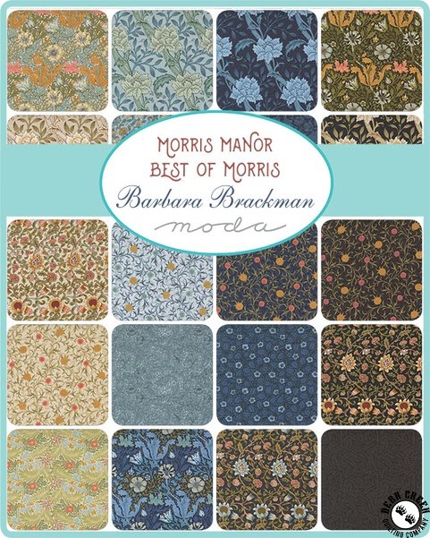 Morris Manor from Barbara Brackman is Moda's latest update of William Morris's classic design. The collection is named for the family's summer home Kelmscott Manor, a riverside house they began renting annually in the 1870s. Morris thought Kelmscott Manor heaven on earth, a spot he captured in colors echoing the seasonal view. At the Morris Manor they boated, their girls grew up and Morris tended his gardens that provided inspiration for the floral prints. We've recolored a few of our favorites from early Morris lines in river-inspired shades of blue and green. Print collectors will be glad to know we've added some not reproduced earlier, such as the leafy Branch and the Scroll floral. These prints will inspire your Arts & Crafts decorating and patchwork projects.