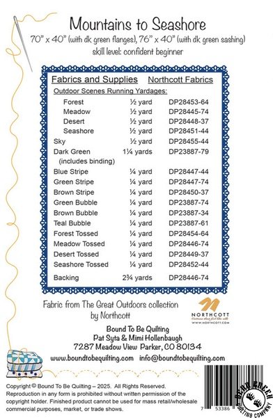 Mountains to Seashore Quilt Pattern View Larger Image Price: SALE $9.79 9 item(s) available. Item # PTN-3548/BTBQ535 | Reg. $13.99 Tweet Pin It Mountains to Seashore Quilt PatternFeaturing the The Great Outdoors fabric collection by Northcott. Pattern and instructions; fabric not included Finished size: 70 inches by 40 inches 76 inches by 40 inches Designed by Pat Syta and Mimi Hollenbaugh Published by Bound To Be Quilting Copyright 2025 Related Products Northcott The Great Outdoors Clouds Blue Item # DP28455-44 | Reg. $12.99 SALE from $9.09 Northcott The Great Outdoors Coastal Ombre Blue/Multi Item # DP28451-44 | Reg. $12.99 SALE from $9.09 Northcott The Great Outdoors Coastal Scene Blue/Multi Item # DP28452-44 | Reg. $12.99 SALE from $9.09 Northcott The Great Outdoors Desert Ombre Rust/Multi Item # DP28448-37 | Reg. $12.99 SALE from $9.09 Northcott The Great Outdoors Desert Scene Rust/Multi Item # DP28449-37 | Reg. $12.99 SALE from $9.09 Northcott The Great Outdoors Meadow Ombre Green/Multi Item # DP28445-74 | Reg. $12.99 SALE from $9.09 Northcott The Great Outdoors Meadow Scene Green/Multi Item # DP28446-74 | Reg. $12.99 SALE from $9.09 Northcott The Great Outdoors Mountain Scene Teal/Multi Item # DP28454-64 | Reg. $12.99 SALE from $9.09 Northcott The Great Outdoors Texture Blue/Multi Item # DP28447-44 | Reg. $12.99 SALE from $9.09 Northcott The Great Outdoors Texture Green/Multi Item # DP28447-74 | Reg. $12.99 SALE from $9.09 Northcott The Great Outdoors Texture Rust/Multi Item # DP28450-37 | Reg. $12.99 SALE from $9.09 Northcott The Great Outdoors Texture Teal/Multi Item # DP28450-64 | Reg. $12.99 SALE from $9.09