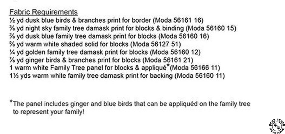 My Tree Quilt Pattern View Larger Image Price: SALE $3.00 5 item(s) available. Item # PTN-CHD2527 | Reg. $11.99 Pin It My Tree Quilt PatternFeaturing the Family Tree fabric collection by Moda Pattern and instructions; fabric not included Finished size is 37 inches by 47 inches Designed by Barb Cherniwchan Published by Coach House Designs Copyright 2026 Related Products Family Grove Quilt Pattern Item # PTN-CHD2525 | Reg. $11.99 SALE from $3.00 Family Tree Fat Quarter Bundle by Moda Item # 56160AB | Reg. $144.99 SALE from $101.49 Family Tree Jelly Roll by Moda Item # 56160JR | Reg. $49.99 SALE from $34.99 Family Tree Layer Cake by Moda Item # 56160LC | Reg. $49.99 SALE from $34.99