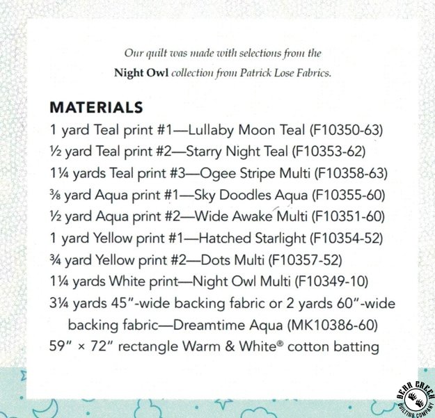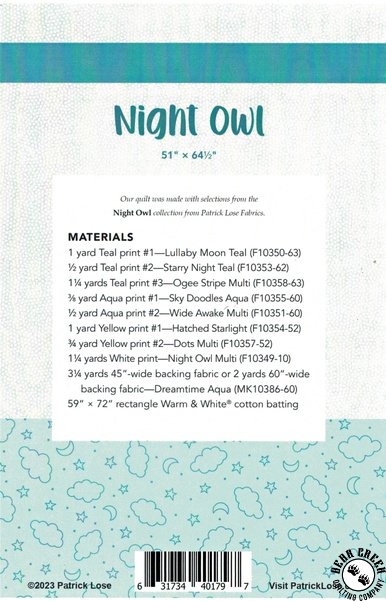 Night Owl Quilt Pattern View Larger Image Price: SALE $10.49 5 item(s) available. Item # PTN-40179 | Reg. $14.99 Pin It Night Owl Quilt PatternFeaturing the Night Owl fabric collection by Northcott. Pattern and instructions; fabric not included Finished quilt measures 51 inches by 64 1/2 inches Designed and Produced by Patrick Lose Copyright 2023