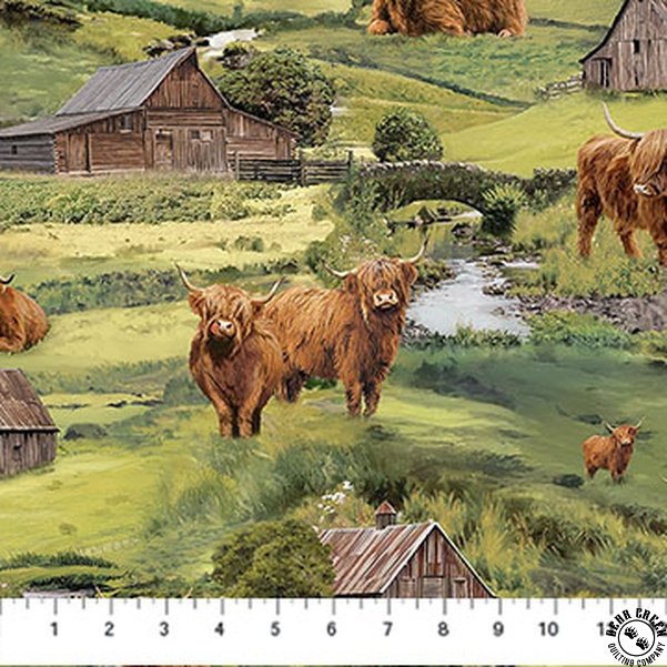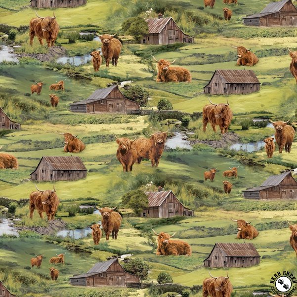 Created by Jason Kirk, Highland Home  is a charming fabric collection with broad, timeless appeal.  Inspired by the beloved cattle of the Scottish Highlands, these iconic cows are known for their long, shaggy coats, expressive eyes, and sweeping horns.  Their gentle, affectionate nature—and undeniable personality—have made them increasingly popular across North America and with makers of all ages.  Highland Home  showcases these endearing creatures through a stunning feature panel, scenic designs, and versatile all-over prints.  A selection of coordinating patterns—including a classic plaid, distressed wood, and richly layered textures—beautifully complements the main motifs.  The collection also includes a quick-sew apron panel and a bag panel, both printed on Northcott’s premium-quality cotton canvas—perfect for gifting or treating yourself!