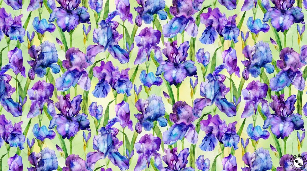 Created by design duo Deborah Edwards and Melanie Samra, Infatuation  is a breathtaking collection illustrated in a classic alcohol ink style.  Lush purple irises—symbols of wisdom, strength, and courage—take center stage, evoking feelings of reverence, admiration, and quiet confidence.  These exuberant blooms shine in sumptuous shades of purple, while a variety of distinctive alcohol ink textures provide depth, movement, and visual intrigue.