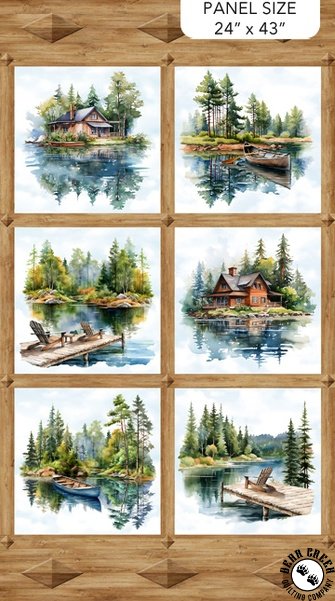 When you arrive at the lake, a sense of calm prevails leaving the hustle and bustle of the city far behind. The sound of waves kissing the shore, wind whispering through the trees and the birds singing in the distance craft a peaceful Lakeside Retreat. Created by Deborah, Edwards, Lakeside Retreat was inspired by her family cottage, a place of beautiful memories. A nature inspired palette of blues, greens, and browns characterizes this collection. Intricately detailed, this watercolor collection features a panel with six blocks, each with a different scene. The scenes can be used as is or deconstructed to use in a large quilt or toss pillows. Other focal prints include a border stripe and a scenic. Trees, ferns, cross grain logs, and pebbles drawn from nature complement the featured prints. Soft clouds and watery textures along with a selection of Toscana blenders completes the coordination. Bring nature home and create your own Lakeside Retreat in the heart of the city.
