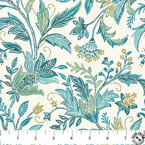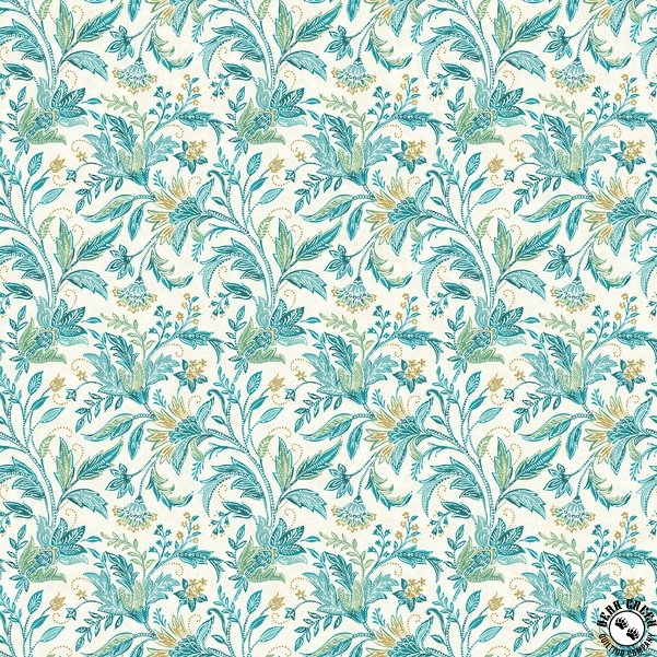 Soft and sophisticated, Mariposa  is defined by a refined palette of cream, saffron, sage, and teal.  Multi-directional florals, scallops, foulards, and mandala motifs add visual depth and versatility, while a full-width border print opens up a wide range of creative possibilities.