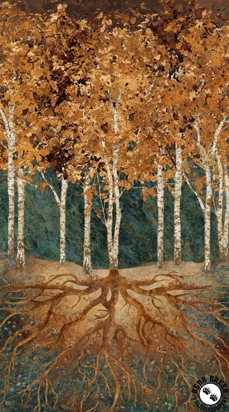 Rooted, the latest Stonehenge collection from Linda Ludovico is firmly rooted in nature with trees, foliage, pebbles, and intricate stone textures including marble and agate in classic Stonehenge tradition. Rich autumn shades of rust, tan are complemented by greens and teals crafting eye catching cool warm color contrast.