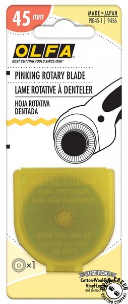 Circular rotary replacement pinking blade designed to place "teeth" on the edge of fabric to reduce raveling and to add a unique edge to any project. Very popular with crafts and memory book development. Also great for use with Polar Fleece! This blade is made of stainless steel for sharpness and durability.