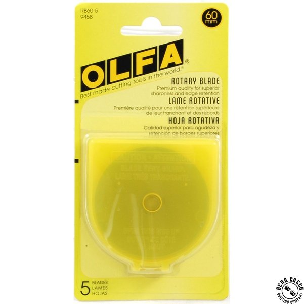 Olfa blade refill for 60mm rotary cutters. Circular rotary replacement blade for the most popular 60mm rotary cutters used for quilting, sewing, and general crafts. Cuts up to 6 layers of fabric. This blade is made of high quality tungsten steel for unparalleled sharpness and superior edge retention.