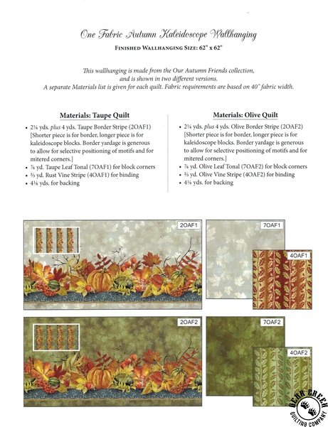 One Fabric Autumn Kaleidoscope Wallhanging Pattern View Larger Image Price: SALE $3.49 1 item(s) available. Item # PTN-ITBOAFKP-05555 | Reg. $4.99 Tweet Pin It One Fabric Autumn Kaleidoscope WallhangingFeaturing the Our Autumn Friends fabric collection by In The Beginning Fabrics. Pattern and instructions; fabric not included Finished quilt measures 62 inches by 62 inches Designed and published by Jason Yenter of In The Beginning Fabrics Copyright 2018