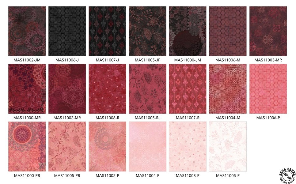 The Operetta  fabric collection captures the beauty of antiquity mixed with a modern aesthetic.  Stylized medallions layered with delicate patterns and motifs create an ombre of colors from light pink to deep rose and charcoal.  Softened textures blend everything together as if touched by time itself, while vintage flourishes breathe life into fragments of the past.  Operetta  offers the perfect prints to blend your own memories into quilts that celebrate the layers of time.