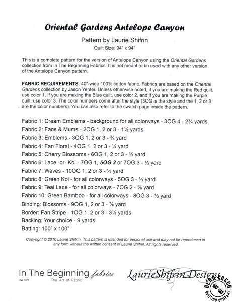 Oriental Gardens Antelope Canyon Quilt Pattern View Larger Image Price: SALE $6.99 3 item(s) available. Item # PTN-OG-ANTELOPE-CANYON | Reg. $9.99 Tweet Pin It Oriental Gardens Antelope Canyon Quilt PatternFeaturing the Oriental Gardens fabric collection by In The Beginning Fabrics. Pattern and instructions; fabric not included Finished quilt measures 94 inches by 94 inches Designedby Laurie Shifrin Published by Laurie Shifrin Designs Copyright 2024 Related Products Oriental Gardens Quilt Pattern Item # PTN-OG-PATT | Reg. $7.99 SALE from $5.59