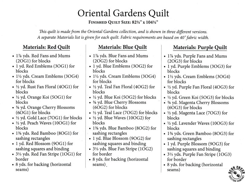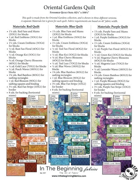 Oriental Gardens Quilt Pattern View Larger Image Price: SALE $5.59 16 item(s) available. Item # PTN-OG-PATT | Reg. $7.99 Pin It Oriental Gardens Quilt PatternFeaturing the Oriental Gardens fabric collection by In The Beginning Fabrics. Pattern and instructions; fabric not included Finished quilt measures 82 1/2 inches by 104 1/2 inches Designed and published by Jason Yenter of In The Beginning Fabrics Copyright 2024 Related Products Oriental Gardens Antelope Canyon Quilt Pattern Item # PTN-OG-ANTELOPE-CANYON | Reg. $9.99 SALE from $6.99