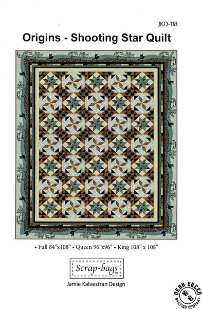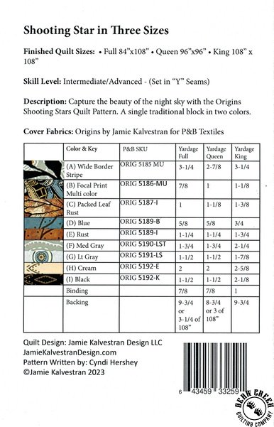 Origins - Shooting Star Quilt Pattern View Larger Image Price: SALE $8.39 3 item(s) available. Item # PTN-JKD-118 | Reg. $11.99 Pin It Origins - Shooting Star Quilt PatternFeaturing the Origins fabric collection by P&B Textiles. Pattern and instructions; fabric not included Finished quilt measures Full = 84 inches by 108 inches Queen = 96 inches by 96 inches King = 108 inches by 108 inches Designed by Cyndi Hershey Published by Jamie Kalvestran Design LLC Copyright 2023