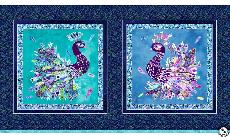 Eulalia Mejia's artwork simply shines in her new Peacock Serenade fabric collection. The large panel blocks feature regal peacocks created in Eulalia's unique style. The cool-toned color palette lends itself to a combination of prints and textures to create this beautifully, complete collection. Two beautiful free quilt patterns are available to inspire you.