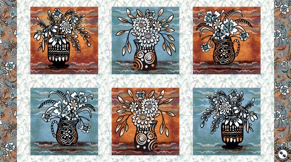 Jamie Kalvestran's unique style and artistic flair are highlighted in every print of her newest Still Life fabric collection. The creative theme, still life imagery, is truly distinctive. The large panel sets the stage, and it is supported by the block panel. Coordinating prints feature multi-color and tonal prints that beautifully support the main designs.