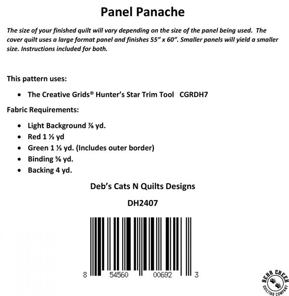 Panel Panache Quilt Pattern View Larger Image Price: SALE $6.99 19 item(s) available. Item # PTN-DH2407 | Reg. $9.99 Tweet Pin It Panel Panache Quilt Pattern Pattern and instructions; fabric not included Finished quilt measures 55 inches by 60 inches Designed by Deb Heatherly Produced by Deb's Cats N Quilts Copyright 2024 Required Tools: Creative Grids Hunter's Star Trim Tool; sold separately Related Products Creative Grids Hunter's Star Trim Tool Item # CGRDH7+PTN $35.49 Huntington Quilt Pattern Item # PTN-DH2405 | Reg. $9.99 SALE from $6.99 Playing Favorites Quilt Pattern Item # PTN-DH2410 | Reg. $9.99 SALE from $6.99 Stars on Parade Quilt Pattern Item # PTN-DH2406 | Reg. $9.99 SALE from $6.99