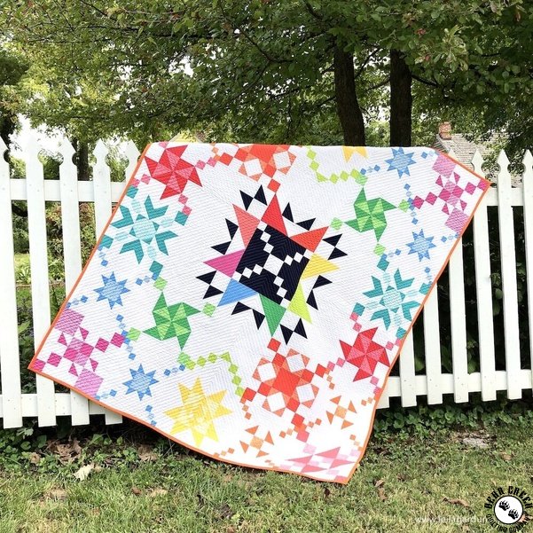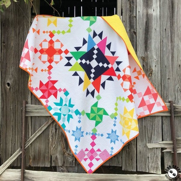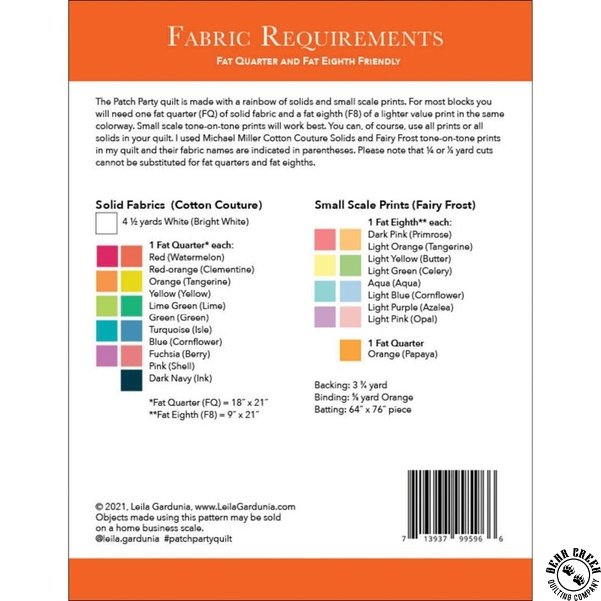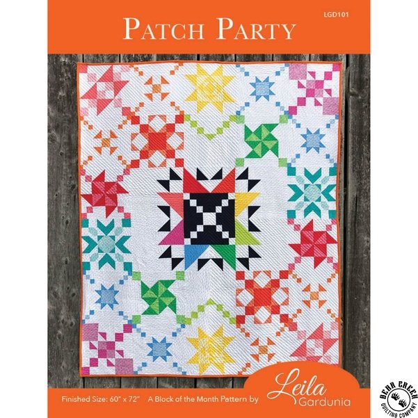 Patch Party is a traditionally pieced, beginner friendly quilt sampler pattern. Quilters will learn and use basic skills like making 4-Patch units, Half-Square Triangles (HST), Quarter-Square Triangles (QST), Flying Geese, and Square-in-a-Square units. It is a great way to learn new piecing techniques. There are 11 different quilt blocks and you will make two copies of 8 blocks, four copies of 2 blocks, and one jumbo center block.