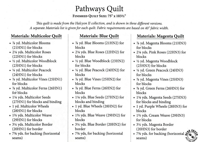 Halcyon II Pathways Quilt Pattern View Larger Image Price: SALE $6.39 4 item(s) available. Item # PTN-HN2-P-PATT | Reg. $7.99 Tweet Pin It Halcyon II Pathways Quilt PatternFeaturing the Halcyon II fabric collection by In The Beginning Fabrics. Pattern and instructions; fabric not included Finished quilt measures 75 inches by 103 1/2 inches Designed and published by Jason Yenter of In The Beginning Fabrics Copyright 2023 Related Products Halcyon II Abundance Quilt Pattern Item # PTN-HN2-A-PATT | Reg. $7.99 SALE from $6.39