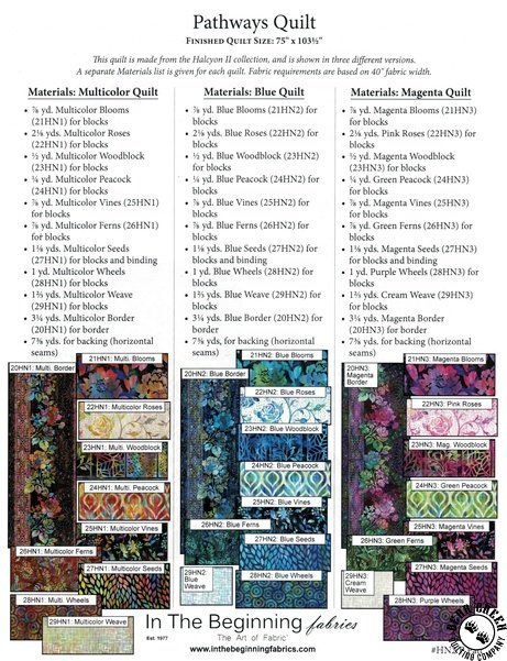 Halcyon II Pathways Quilt Pattern View Larger Image Price: SALE $5.59 4 item(s) available. Item # PTN-HN2-P-PATT | Reg. $7.99 Tweet Pin It Halcyon II Pathways Quilt PatternFeaturing the Halcyon II fabric collection by In The Beginning Fabrics. Pattern and instructions; fabric not included Finished quilt measures 75 inches by 103 1/2 inches Designed and published by Jason Yenter of In The Beginning Fabrics Copyright 2023 Related Products Halcyon II Abundance Quilt Pattern Item # PTN-HN2-A-PATT | Reg. $7.99 SALE from $5.59