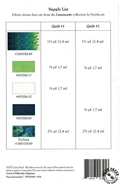 Peacock Garden Quilt Pattern View Larger Image Price: SALE $8.39 5 item(s) available. Item # PTN-2880 | Reg. $11.99 Pin It Peacock Garden Quilt PatternFeaturing the Luminosity fabric collection by Northcott. Pattern and instructions; fabric not included Finished size is 40 inches by 56 1/2 inches Authored by Jean Boyd Published by Patterns by Jean Boyd Copyright 2022 Related Products Flitter Quilt Pattern Item # PTN-2883 | Reg. $11.99 SALE from $8.39