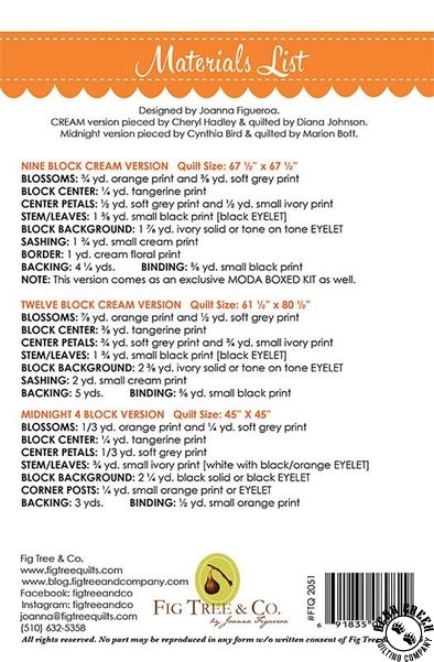 Pecan Blossoms Quilt Pattern View Larger Image Price: SALE $8.39 1 item(s) available. Item # PTN-FTQ2051 | Reg. $11.99 Tweet Pin It Pecan Blossoms Quilt PatternFeaturing the Agatha Road fabric collection by Fig Tree & Co. for Moda. Pattern and instructions; fabric not included Finished size: Nine Block = 67 1/2 inches by 67 1/2 inches Twelve Block = 61 1/2 inches by 80 1/2 inches Four Block = 45 inches by 45 inches Designed by Joanna Figueroa Published by Fig Tree & Co. Copyright 2025 Related Products Pumpkins and Cream Quilt Pattern Item # PTN-FTQ1465 | Reg. $11.99 SALE from $8.39