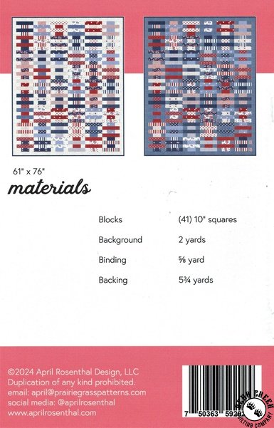 Pioneer Day Quilt Pattern View Larger Image Price: SALE $8.39 2 item(s) available. Item # PTN-PGP-199 | Reg. $11.99 Tweet Pin It Pioneer Day Quilt PatternFeaturing the Star Spangled fabric collection by Moda. Pattern and instructions; fabric not included Finished size is 61 inches by 76 inches Designed by April Rosenthal Published by Prairie Grass Patterns Copyright 2025 Related Products Good Folks Quilt Pattern Item # PTN-PGP-198 | Reg. $11.99 SALE from $8.39 Star Spangled Fat Quarter Bundle by Moda Item # 24170AB | Reg. $109.99 SALE from $76.99