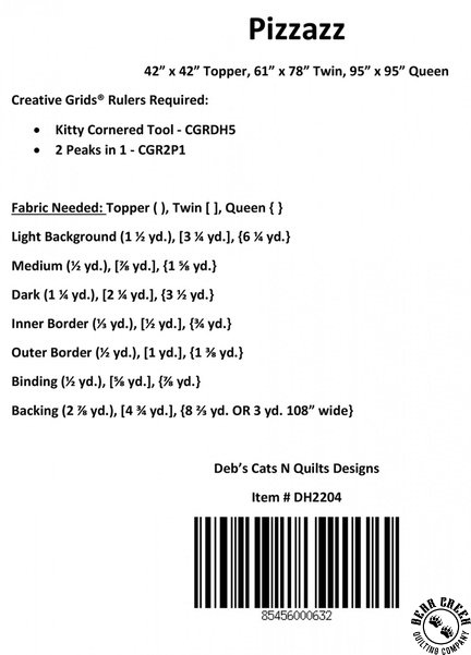 Pizzazz Quilt Pattern View Larger Image Price: SALE $7.99 2 item(s) available. Item # PTN-DH2204 | Reg. $9.99 Tweet Pin It Pizzazz Quilt Pattern Pattern and instructions; fabric not included Finished quilt measures: Topper = 42 inches by 42 inches Twin = 61 inches by 78 inches Queen = 95 inches by 95 inches Designed by Deb Heatherly Produced by Deb's Cats N Quilts Copyright 2024 Required Tools: Creative Grids Kitty Cornered Ruler; sold separately Creative Girds Two Peaks in One Triangle Quilt Ruler; sold separately Related Products Creative Grids Two Peaks in One Triangle Quilt Ruler Item # CGR2P1+PTN | Reg. $33.99 SALE from $27.19 Huntington Quilt Pattern Item # PTN-DH2405 | Reg. $9.99 SALE from $7.99 Panel Panache Quilt Pattern Item # PTN-DH2407 | Reg. $9.99 SALE from $7.99 Playing Favorites Quilt Pattern Item # PTN-DH2410 | Reg. $9.99 SALE from $7.99