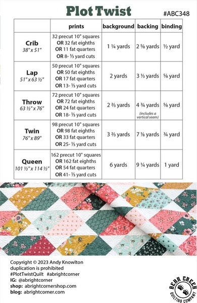 Plot Twist Quilt PatternPlot Twist is a great pattern to use your favorite 10" Squares, Fat Quarters, Fat Eighths, yardage, and even scraps! This pattern looks great in either prings or solids and includes five size options.