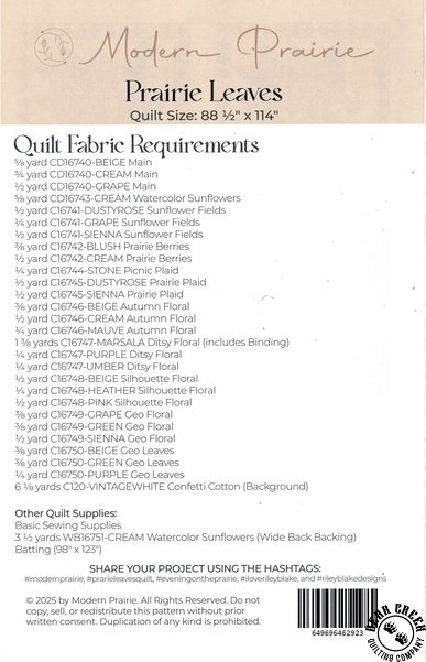 Prairie Leaves Quilt Pattern View Larger Image Price: SALE $11.99 9 item(s) available. Item # PTN-649696462923 | Reg. $14.99 Tweet Pin It Prairie Leaves Quilt PatternFeaturing the Evening on the Prairie fabric collection by Modern Prairie for Riley Blake Designs. Pattern and instructions; fabric not included Finished size is 88 1/2 inches by 114 inches Designed by Melissa Gilbert Published by Modern Prairie Copyright 2025 Related Products Evening on the Prairie 10" Squares by Riley Blake Designs Item # 10-16740-42 | Reg. $49.99 SALE from $39.99 Evening on the Prairie 5" Squares by Riley Blake Designs Item # 5-16740-42 | Reg. $14.99 SALE from $11.99 Evening on the Prairie Fat Quarter Bundle by Riley Blake Designs Item # FQ-16740-27 | Reg. $89.99 SALE from $71.99 Evening on the Prairie Free Quilt Pattern Item # evening-on-the-prairie-free-quilt-pattern $0.00 Evening on the Prairie Strip Roll by Riley Blake Designs Item # RP-16740-40 | Reg. $49.99 SALE from $39.99 Laura's Log Cabin Quilt Pattern Item # PTN-649696112446 | Reg. $14.99 SALE from $11.99 Prairie Garden Quilt Pattern Item # PTN-649696400659 | Reg. $14.99 SALE from $11.99 Riley Blake Designs Evening on the Prairie Tote Panel Grape Item # HD16755-GRAPE | Reg. $18.99 SALE from $15.19 Riley Blake Designs Evening on the Prairie Tote Panel Sienna Item # HD16755-SIENNA | Reg. $18.99 SALE from $15.19 Riley Blake Evening on the Prairie Autumn Floral Beige Item # CD16746-BEIGE | Reg. $11.99 SALE from $9.59 Riley Blake Evening on the Prairie Autumn Floral Cream Item # CD16746-CREAM | Reg. $11.99 SALE from $9.59 Riley Blake Evening on the Prairie Autumn Floral Mauve Item # CD16746-MAUVE | Reg. $11.99 SALE from $9.59 Riley Blake Evening on the Prairie Berries Blush Item # CD16742-BLUSH | Reg. $11.99 SALE from $9.59 Riley Blake Evening on the Prairie Berries Cream Item # CD16742-CREAM | Reg. $11.99 SALE from $9.59 Riley Blake Evening on the Prairie Ditsy Floral Marsala Item # CD16747-MARSALA | Reg. $11.99 SALE from $9.59 Riley Blake Evening on the Prairie Ditsy Floral Purple Item # CD16747-PURPLE | Reg. $11.99 SALE from $9.59 Riley Blake Evening on the Prairie Ditsy Floral Umber Item # CD16747-UMBER | Reg. $11.99 SALE from $9.59 Riley Blake Evening on the Prairie Geo Floral Grape Item # CD16749-GRAPE | Reg. $11.99 SALE from $9.59 Riley Blake Evening on the Prairie Geo Floral Green Item # CD16749-GREEN | Reg. $11.99 SALE from $9.59 Riley Blake Evening on the Prairie Geo Floral Sienna Item # CD16749-SIENNA | Reg. $11.99 SALE from $9.59 Riley Blake Evening on the Prairie Geo Leaves Beige Item # CD16750-BEIGE | Reg. $11.99 SALE from $9.59 Riley Blake Evening on the Prairie Geo Leaves Green Item # CD16750-GREEN | Reg. $11.99 SALE from $9.59 Riley Blake Evening on the Prairie Geo Leaves Purple Item # CD16750-PURPLE | Reg. $11.99 SALE from $9.59 Riley Blake Evening on the Prairie Main Beige Item # CD16740-BEIGE | Reg. $11.99 SALE from $9.59 Riley Blake Evening on the Prairie Main Cream Item # CD16740-CREAM | Reg. $11.99 SALE from $9.59 Riley Blake Evening on the Prairie Main Grape Item # CD16740-GRAPE | Reg. $11.99 SALE from $9.59 Riley Blake Evening on the Prairie Picnic Plaid Stone Item # CD16744-STONE | Reg. $11.99 SALE from $9.59 Riley Blake Evening on the Prairie Plaid Dusty Rose Item # CD16745-DUSTYROSE | Reg. $11.99 SALE from $9.59 Riley Blake Evening on the Prairie Plaid Sienna Item # CD16745-SIENNA | Reg. $11.99 SALE from $9.59 Riley Blake Evening on the Prairie Silhouette Floral Beige Item # CD16748-BEIGE | Reg. $11.99 SALE from $9.59 Riley Blake Evening on the Prairie Silhouette Floral Heather Item # CD16748-HEATHER | Reg. $11.99 SALE from $9.59 Riley Blake Evening on the Prairie Silhouette Floral Pink Item # CD16748-PINK | Reg. $11.99 SALE from $9.59 Riley Blake Evening on the Prairie Sunflower Dusty Rose Item # CD16741-DUSTYROSE | Reg. $11.99 SALE from $9.59 Riley Blake Evening on the Prairie Sunflower Grape Item # CD16741-GRAPE | Reg. $11.99 SALE from $9.59 Riley Blake Evening on the Prairie Sunflower Sienna Item # CD16741-SIENNA | Reg. $11.99 SALE from $9.59 Riley Blake Evening on the Prairie Sunflowers Cream Item # CD16753-CREAM | Reg. $11.99 SALE from $9.59