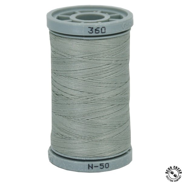 100% long staple Egyptian Cotton, 3 ply, mercerized for strength, colorfast and shrinkfast, tightly twisted and balanced, and virtually lint free. Available in 40, 50, and 60 weights - the higher the number, the finer the thread.