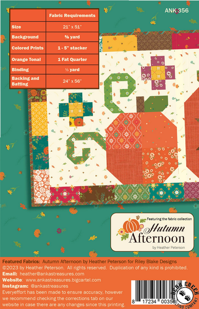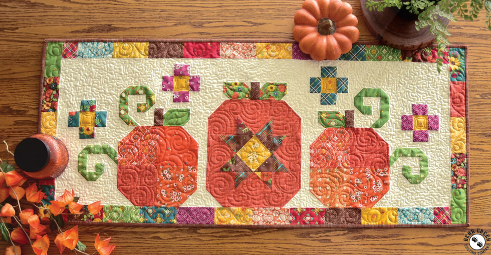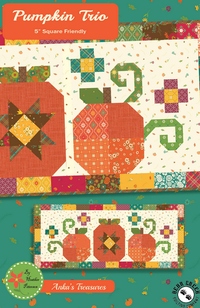 Pumpkin Trio Quilt Pattern View Larger Image Price: SALE $8.39 25 item(s) available. Item # PTN-ANK356 | Reg. $11.99 Pin It Pumpkin Trio Quilt PatternFeaturing the Autumn Afternoon fabric collection by Riley Blake Designs. Pattern and instructions; fabric not included Finished size is 21 inches by 51 inches Authored by Heather Peterson Published by Anka Treasures Copyright 2023