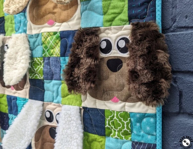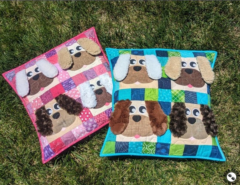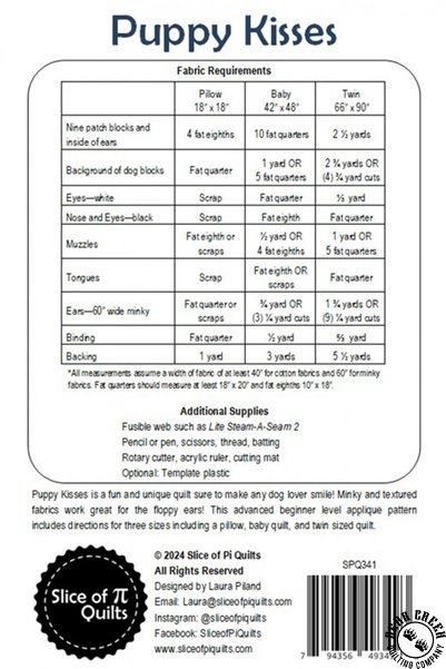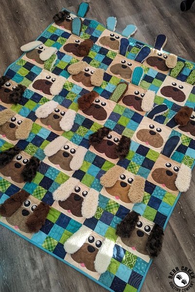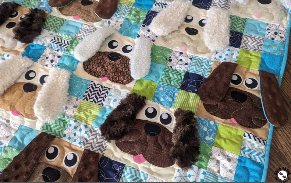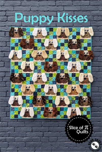 Puppy Kisses is a fun and unique quilt sure to make any dog lover smile! Minky and/or textured fabrics work great for the floppy ears! This advanced beginner level applique pattern includes directions for three sizes including a pillow, baby quilt, and twin sized quilt.