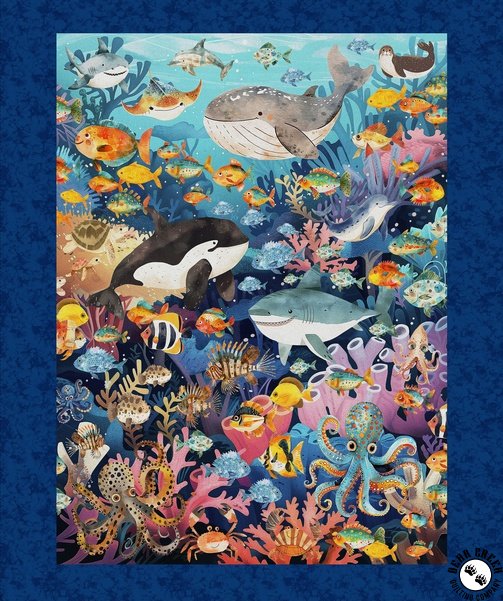 Dive into a whimsical underwater world with Deep Sea Dazzle!  This vibrant collection features playful sea creatures — from whales and octopi to crabs and sharks — brought to life in vivid color and charming detail.  Perfect for quilts, room decor, apparel, and accessories, these designs will spark the imagination and delight young ocean explorers on a colorful undersea adventure.