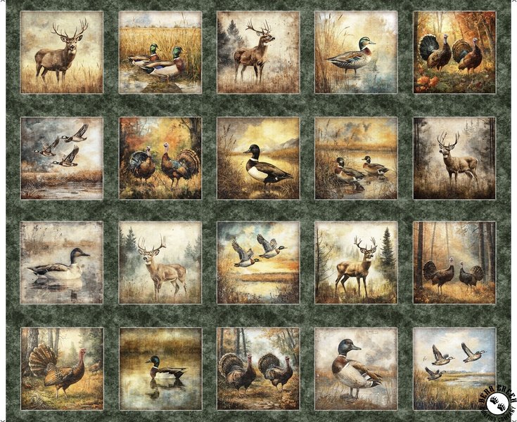 Answer the call of the wild with Forest, Field and Stream  by QT Fabrics. This striking collection celebrates the great outdoors with deer, mallards, dogs, turkeys, and more—beautifully rendered in rich detail and rustic style. Picturesque wildlife vignette patches and coordinating prints provide endless possibilities for quilts, decor, and accessories designed for the outdoors-person or avid hunter. Create projects that bring the beauty of nature indoors!