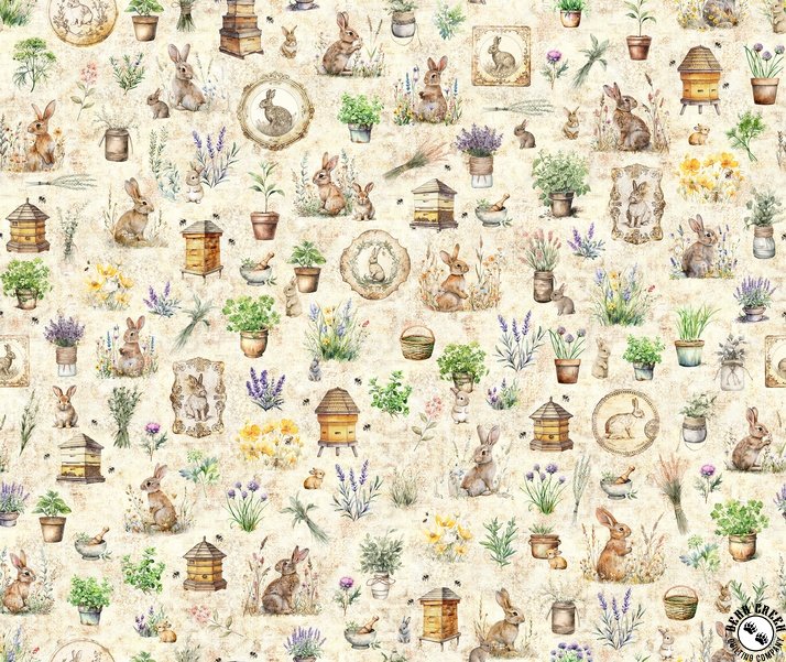 Hunny Bunny is a sophisticated springtime fabric collection with assorted collage, floral, bunny and garden prints. Starring a picture patch panel with 25 unique blocks and touches of goldenrod and lilac to bring extra pop to your projects.