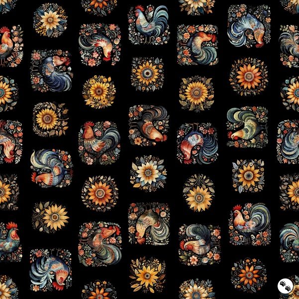 QT Fabrics Poultry in Motion Roosters and Sunflowers Black