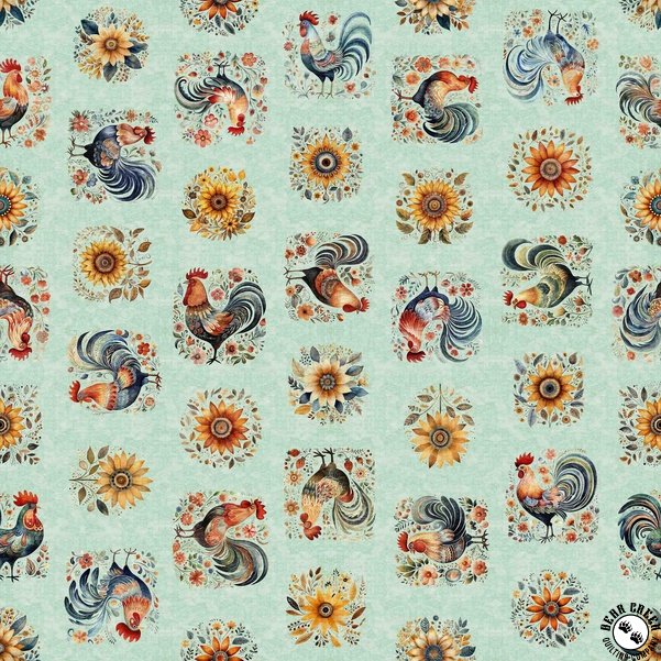 QT Fabrics Poultry in Motion Roosters and Sunflowers Sage