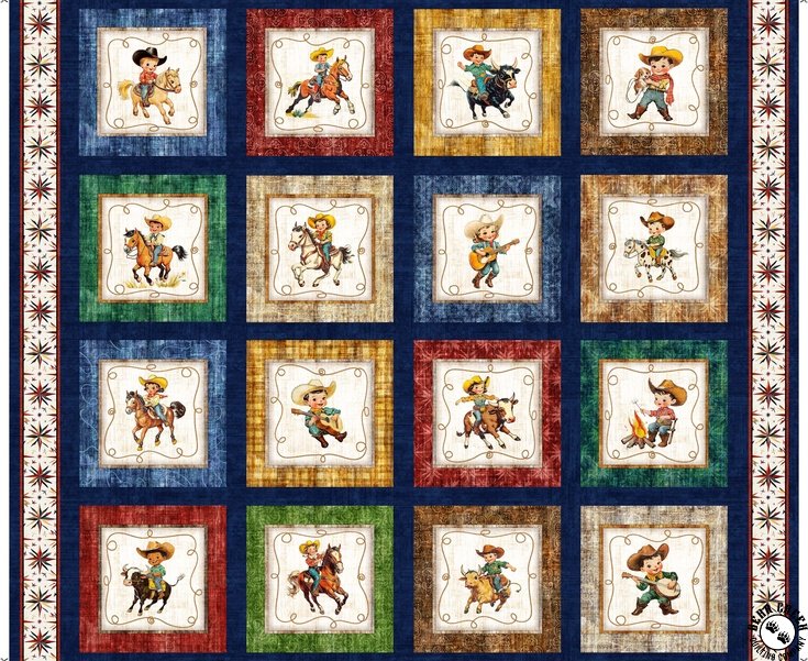 Create adorable projects for a little rancher (and relive your childhood!) Picture patches, border stripes, and coordinates feature retro styled cowboys and cowgirls, cowboy hats and boots, farm animals, stars, and more. Perfect for quilts, room décor and accessories.