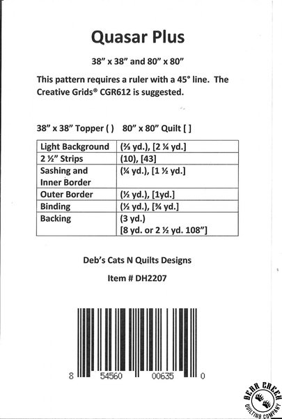 Quasar Plus Quilt Pattern View Larger Image Price: $9.99 1 item(s) available. Item # PTN-DH2207 Tweet Pin It Quasar Quilt PatternBonus Table Runner included! Pattern and instructions; fabric not included Finished quilt measures 80 inches by 80 inches Designed by Deb Heatherly Produced by Deb's Cats N Quilts Copyright 2024 Related Products Community Quilt Pattern Item # PTN-DH2304 $13.99 Convergence Quilt Pattern Item # PTN-DH2511 $9.99 Creative Grids Cat's Cradle Tool Item # CGRDH1+PTN $24.99 Creative Grids Folded Corner Clipper Tool Item # CGRFCC+PTN $19.99 Creative Grids Kitty Cornered Ruler Item # CGRDH5+PTN $32.49 Creative Grids Quilting Ruler 5 1/2 Inch Square Item # CGR5 $19.49 Creative Grids Turbo 4 Patch Template Item # CGRDH3+PTN $24.99 Creative Grids Ultimate Flying Geese Template and Quilt Ruler Item # CGRDH4+PTN $29.99 Crossroads Quilt Pattern Item # PTN-DH2401 $9.99 Sparkle Quilt Pattern Item # PTN-DH2402 $9.99 Woven Stars Quilt Pattern Item # PTN-DH2508 $9.99