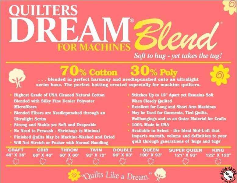 Quilters Dream Batting  proudly offers premium quality quilt batting manufactured for independent quilt shops.  Quilters Dream Batting  provides warmth, drape, volume, definition, and support; an exceptional choice to provide the best foundation for beloved quilts.  From show pieces, to wall hangings, to heirloom quilts lasting through generations of love.