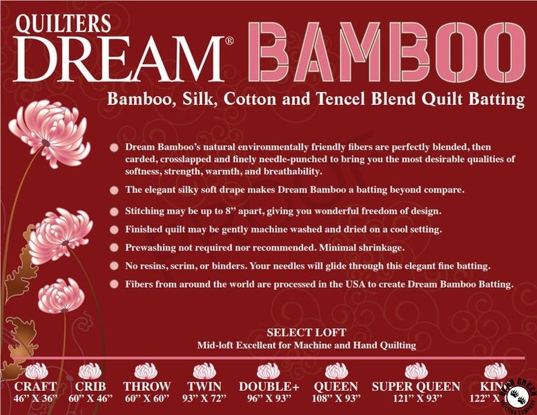 :  Blend of velvety Bamboo, luscious Tussah Silk, strong silky Botanic Tencel®, and soft stable Cotton.  Quilter's Dream most elegant quilt batting!  Natural environmentally friendly fibers are blended, carded, crosslapped, and finely needle punched to bring you unparalleled softness, strength, warmth, and breathability.  The luscious silky soft drape make Dream Bamboo a quilt batting beyond compare!  Stitch up to 8" apart.  Excellent for hand, domestic, and longarm quilting.  No prewashing required.  Shrinkage is minimal.  May be machine washed and dried.